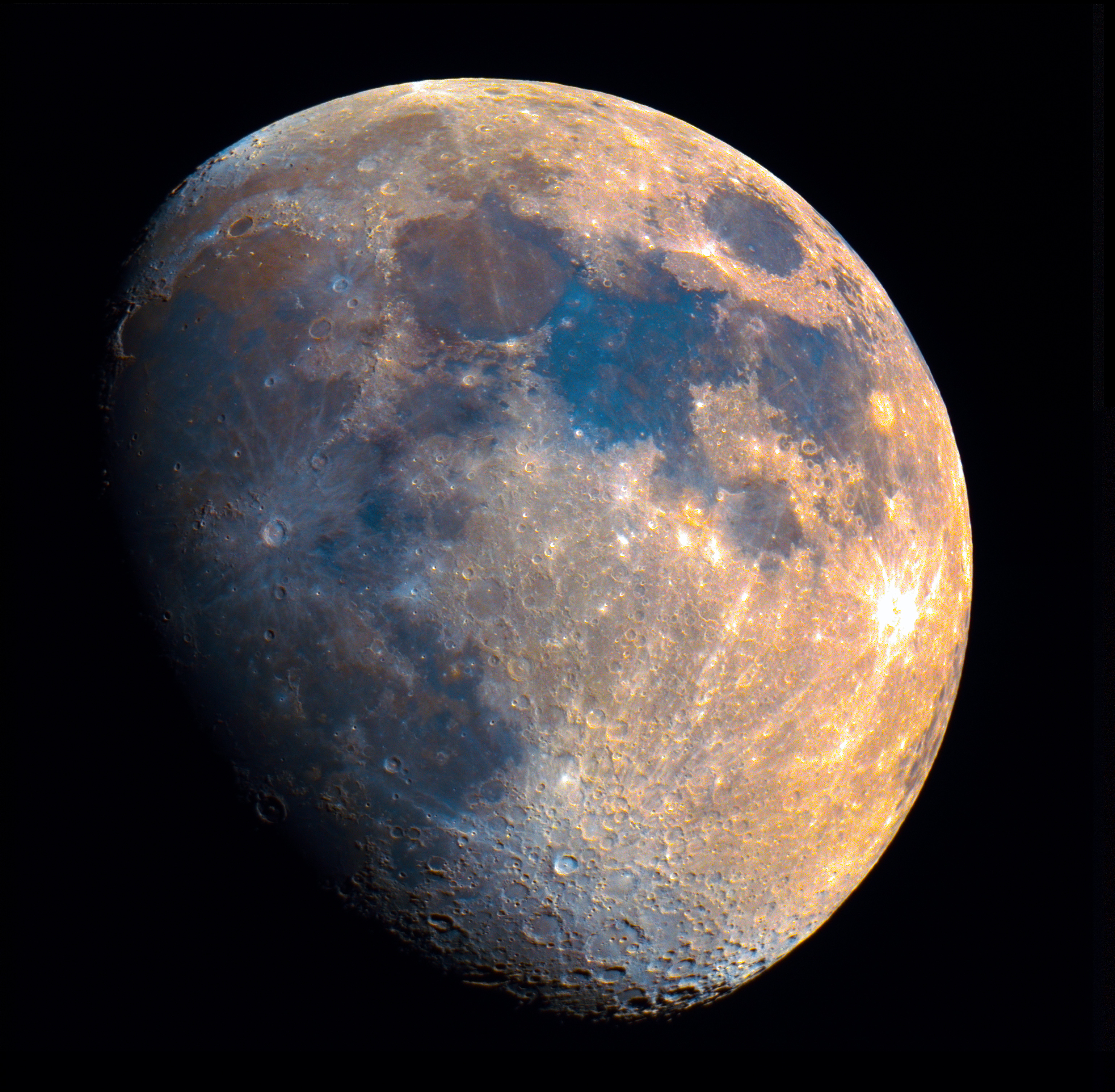 Луна не совсем черно-белая, ее поверхность слегка цветная. Если выкрутить ползунок насыщенности при обработке, становятся заметны различия в цвете. Цвет зависит от химического состава поверхности. Синие оттенки - области, богатые титаном; оранжевые - с пониженным содержанием титана и железа.