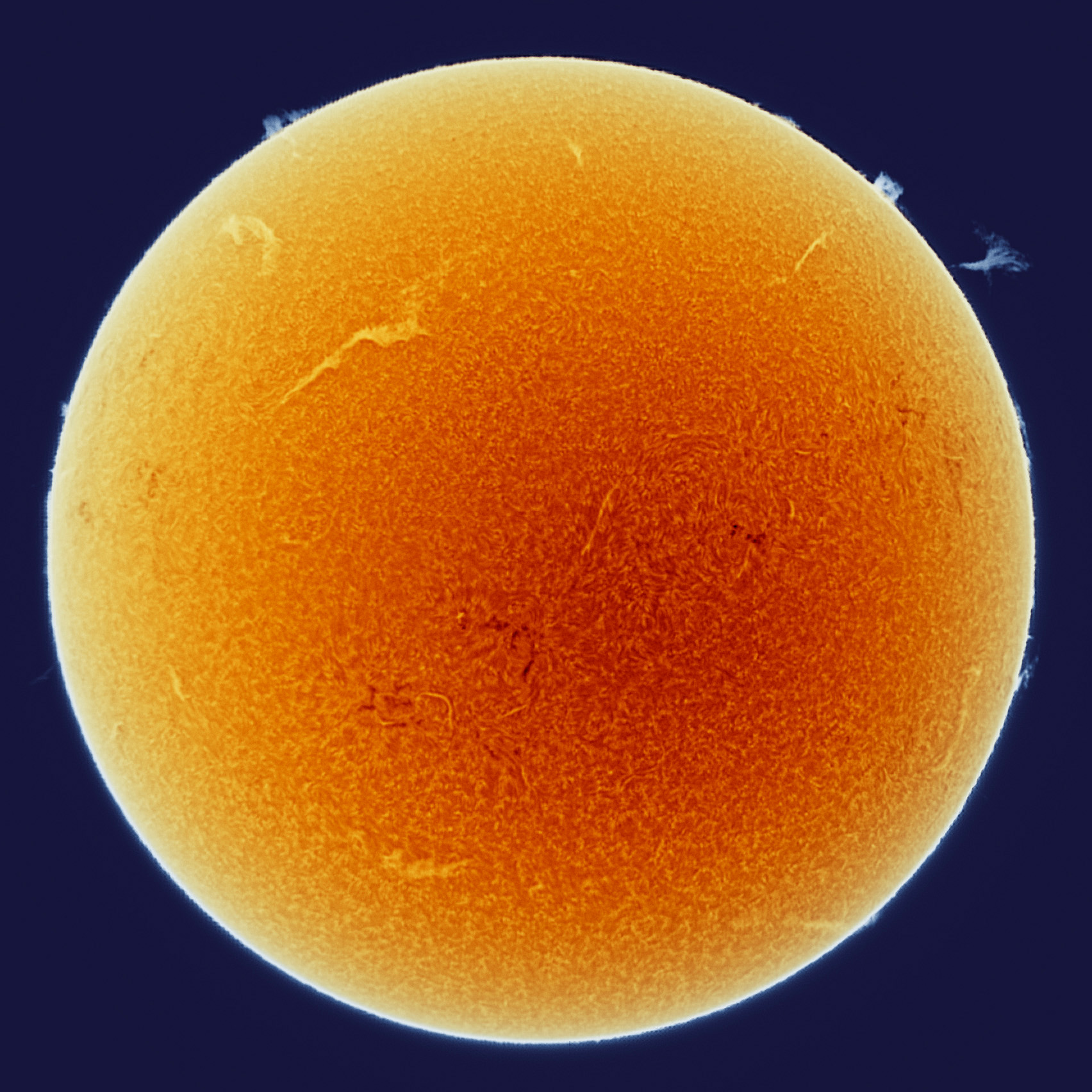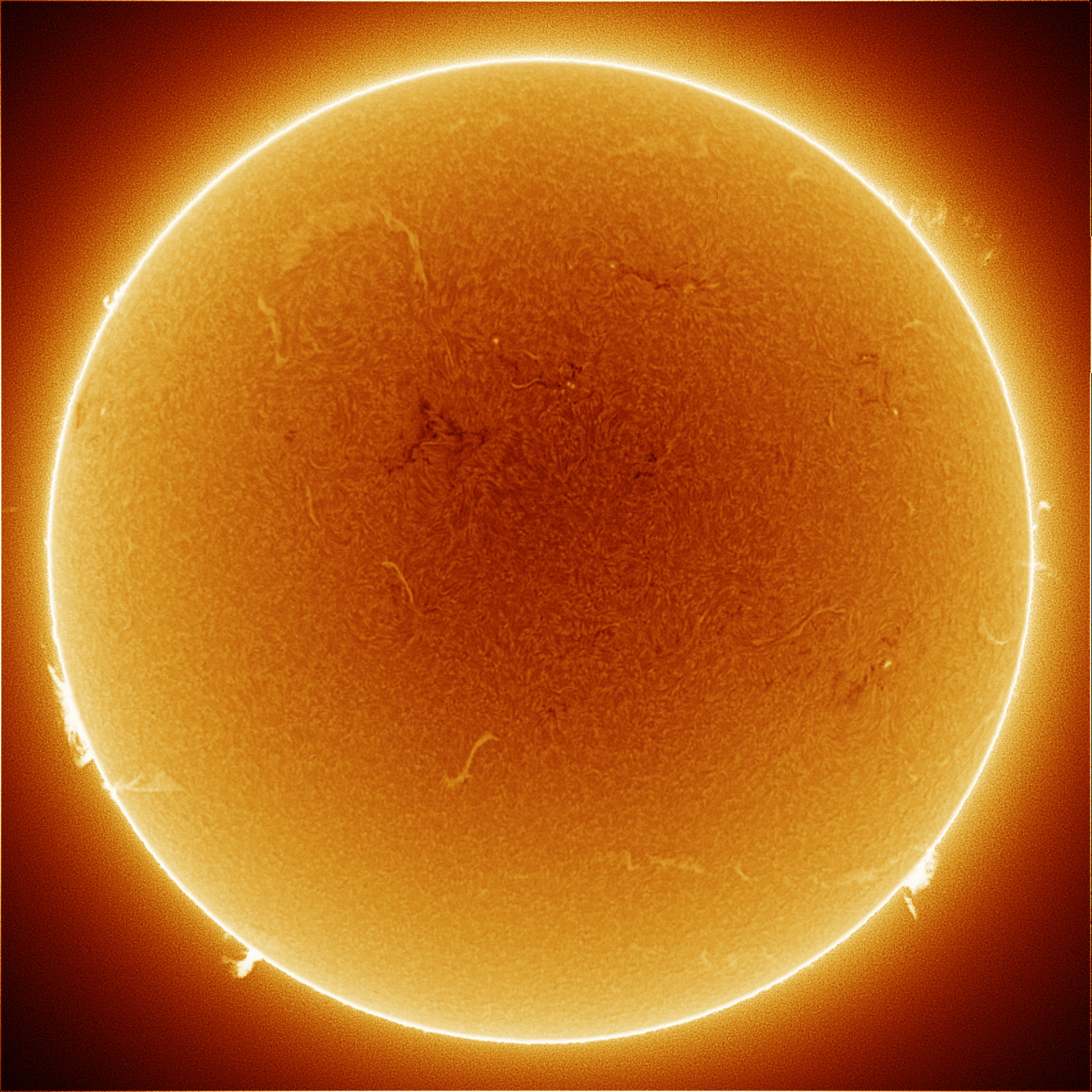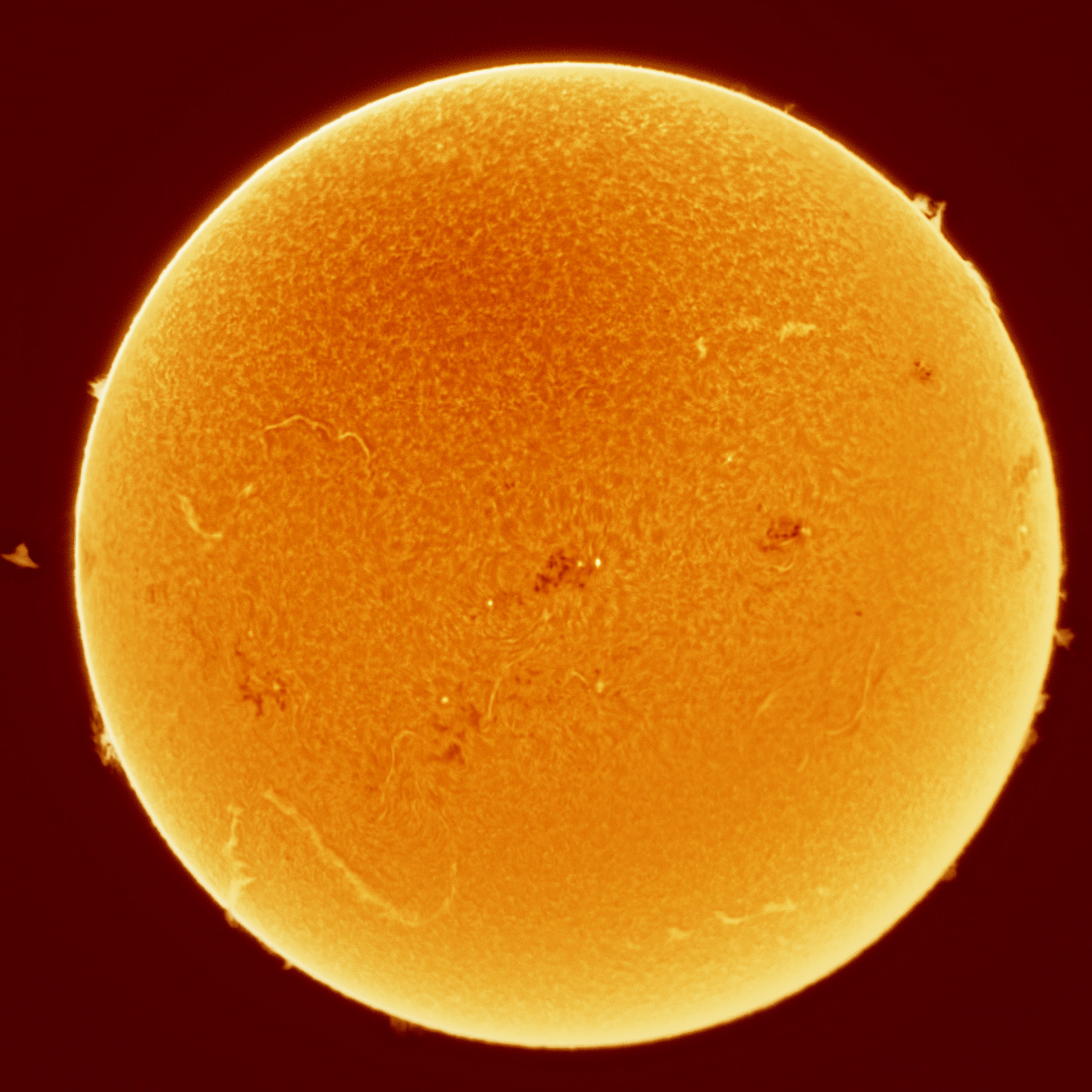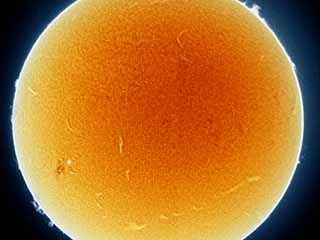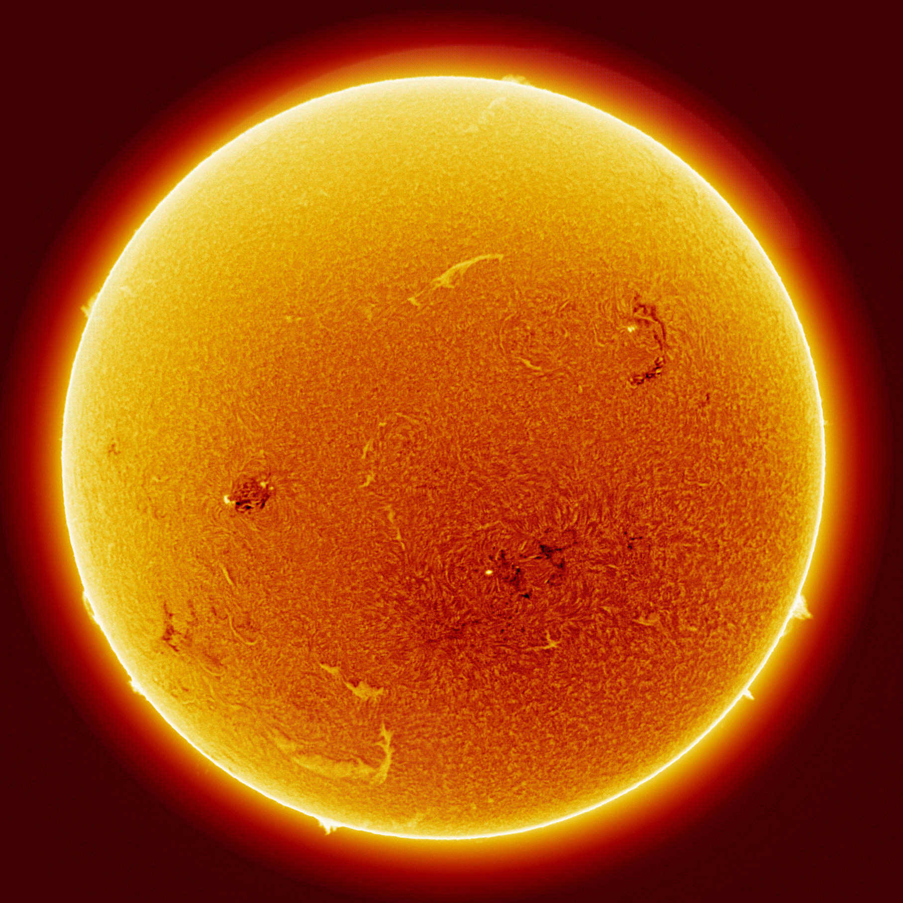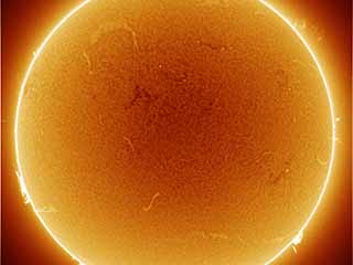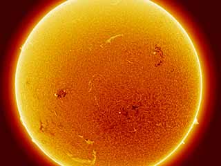 Если из яркого белого света Солнца выделить лишь узкую часть красного света при помощи специального солнечного телескопа, то глазу станет доступна невидимая ранее линия излучения атомов водорода. На Солнце в таком свете станут доступны изучению совершенно новые явления: спикулы, факелы, вспышки, протуберанцы и филаменты.