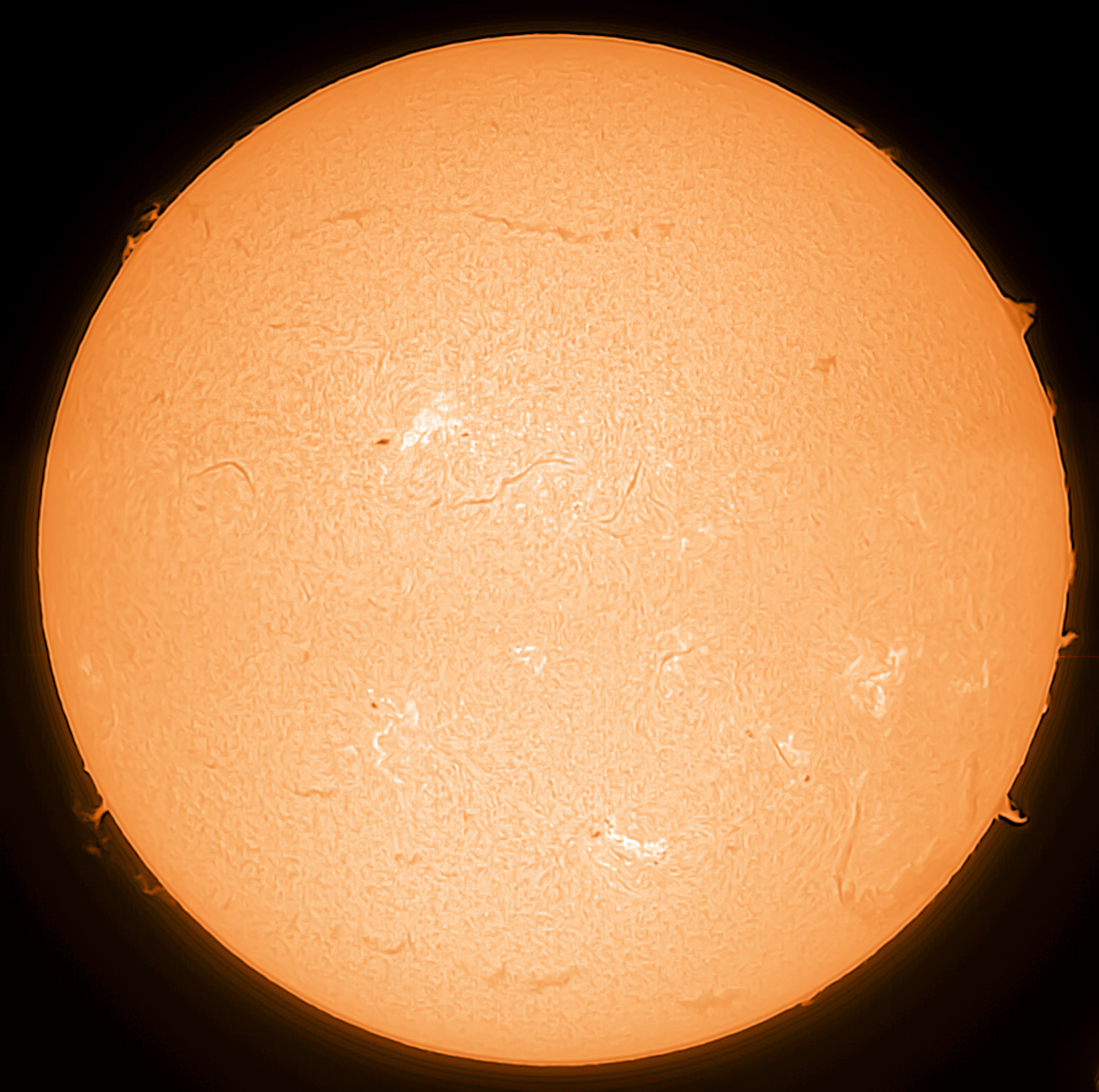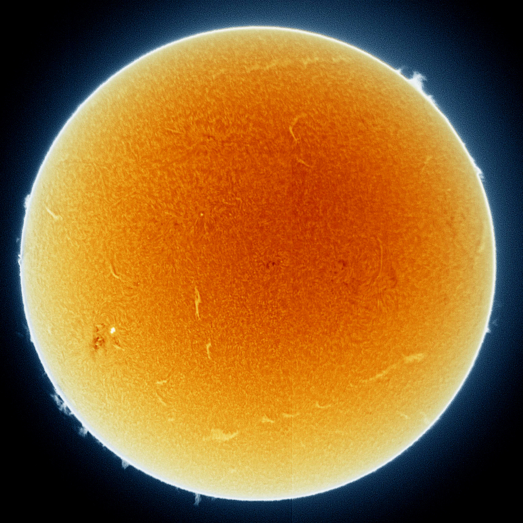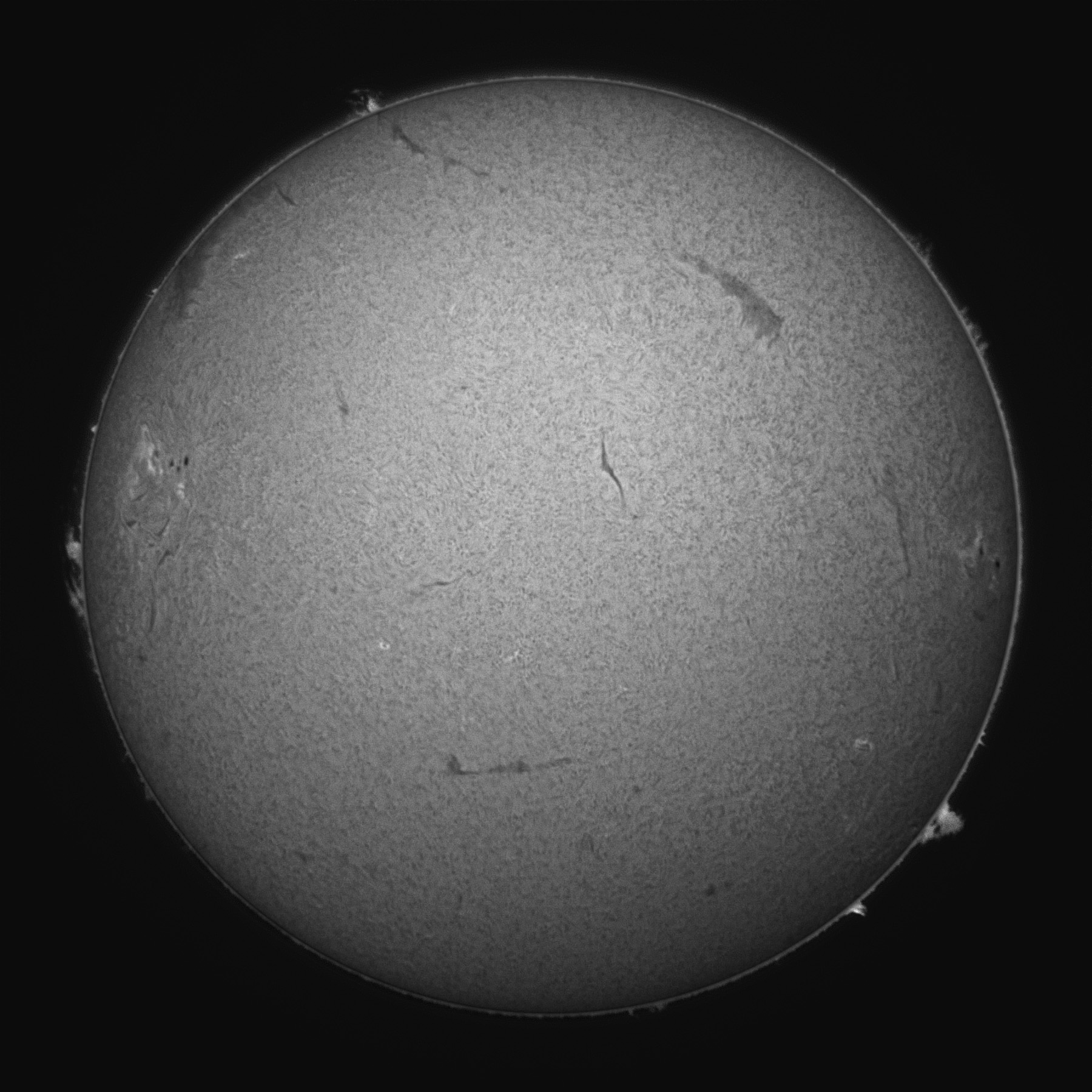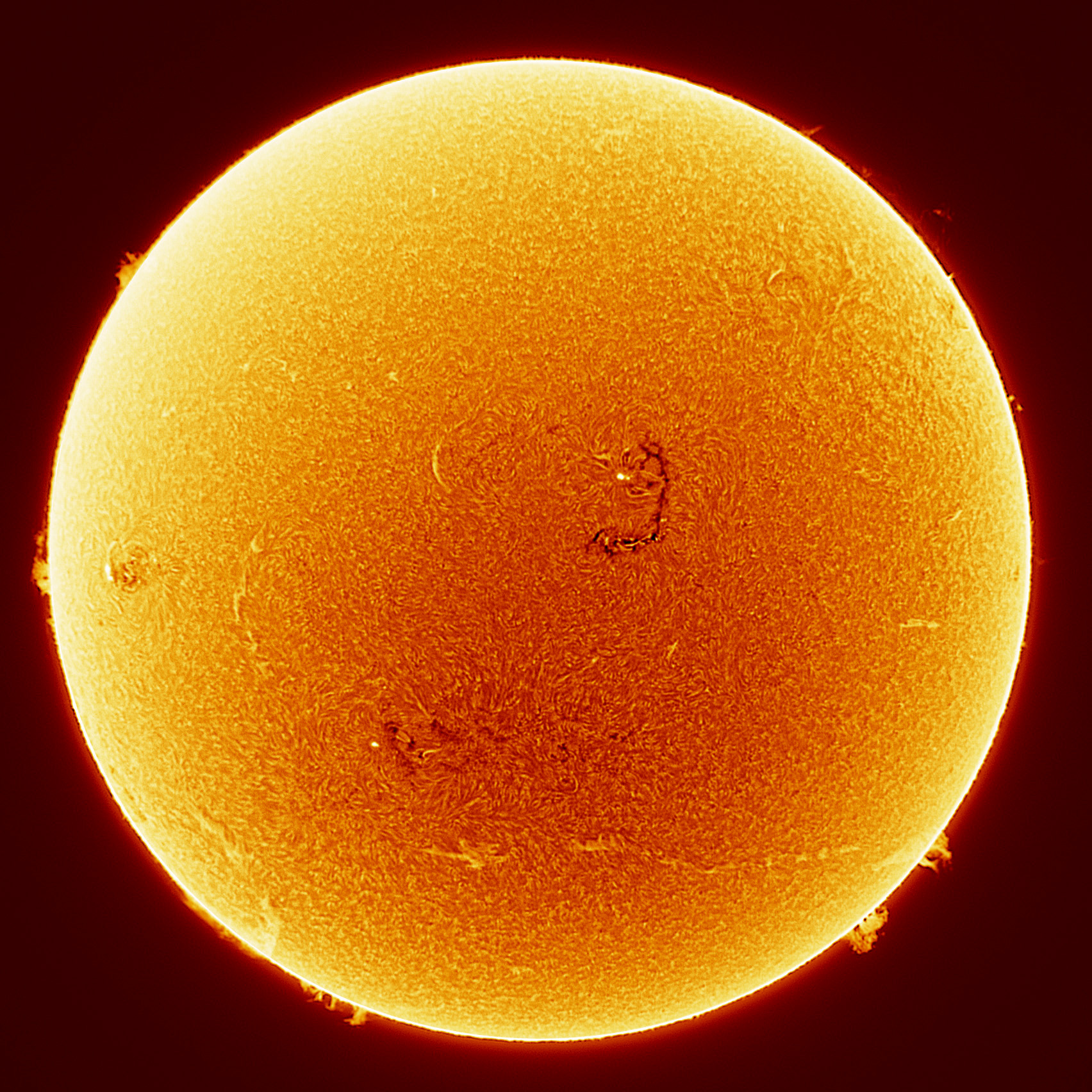 Если из яркого белого света Солнца выделить лишь узкую часть красного света при помощи специального солнечного телескопа, то глазу станет доступна невидимая ранее линия излучения атомов водорода. На Солнце в таком свете станут доступны изучению совершенно новые явления: спикулы, факелы, вспышки, протуберанцы и филаменты.
