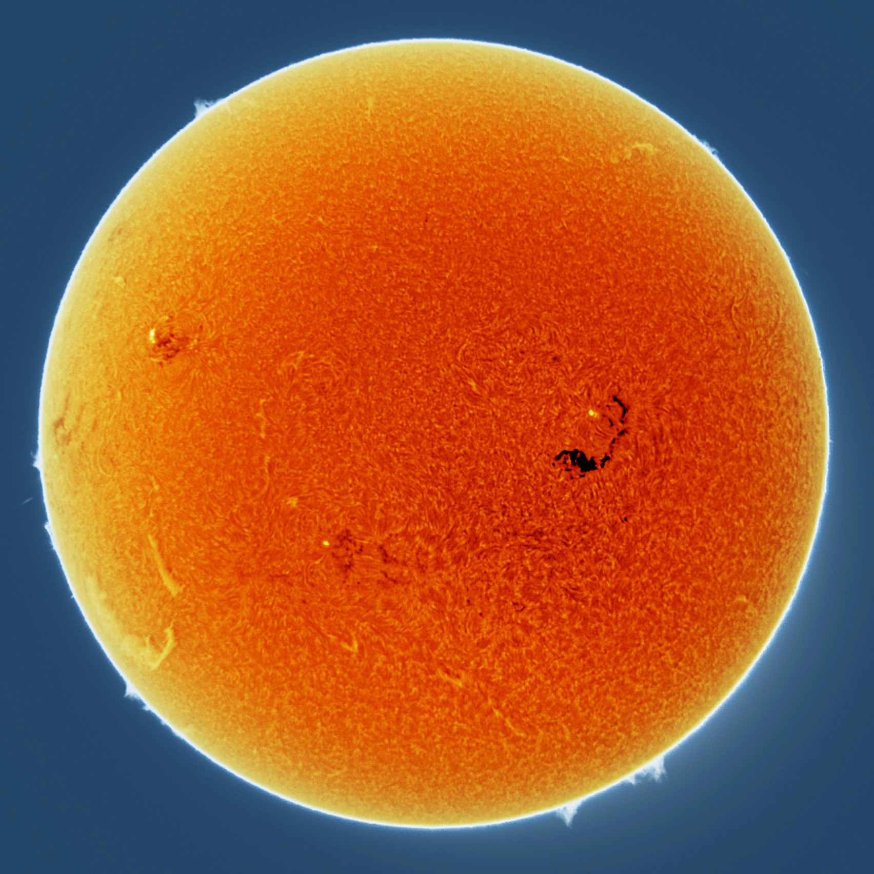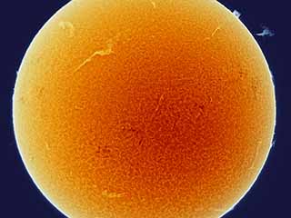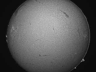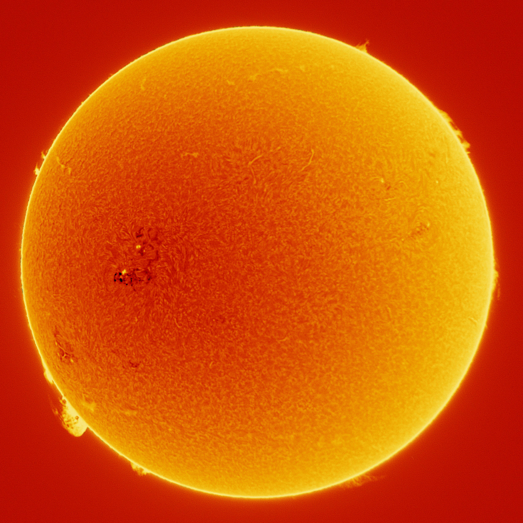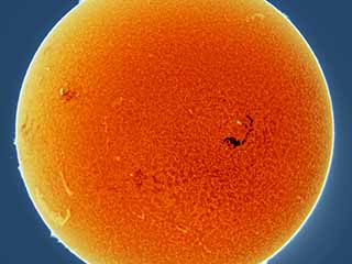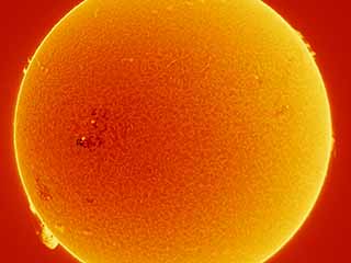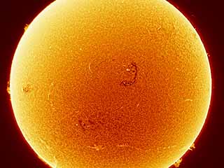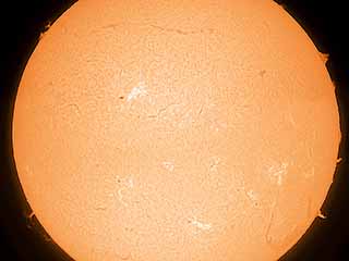 Фотосфера - самая яркая часть солнечной атмосферы. Именно ее слепящий белый свет мы видим невооруженным глазом. Специальный нейтральный солнечный фильтр приглушает ее яркость в 10000 раз и позволяет нам с легкостью наблюдать такие солнечные явления, как пятна и грануляцию. Солнечные пятна — тёмные области на Солнце, температура которых понижена примерно на 1500 градусов по сравнению с окружающими участками.